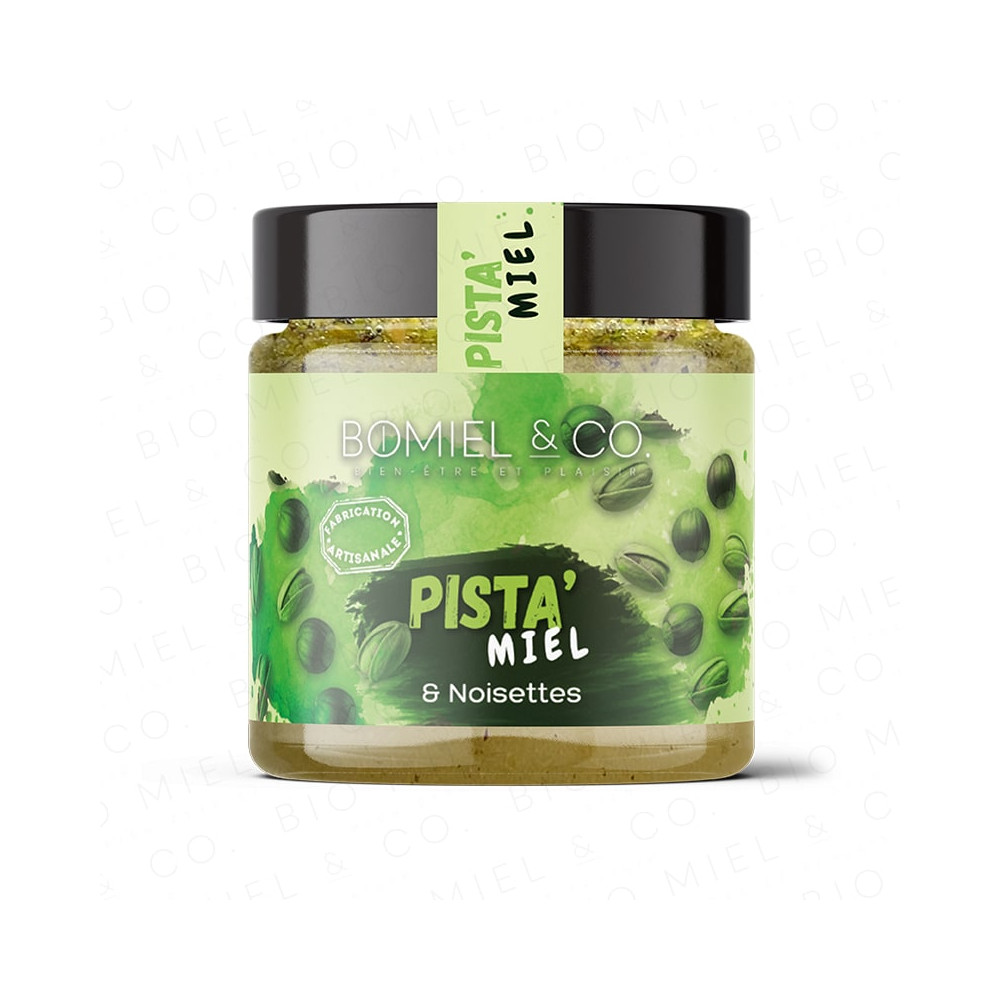 Composition : Miel pur, poudre de pistache BIO, noisette torréfiées